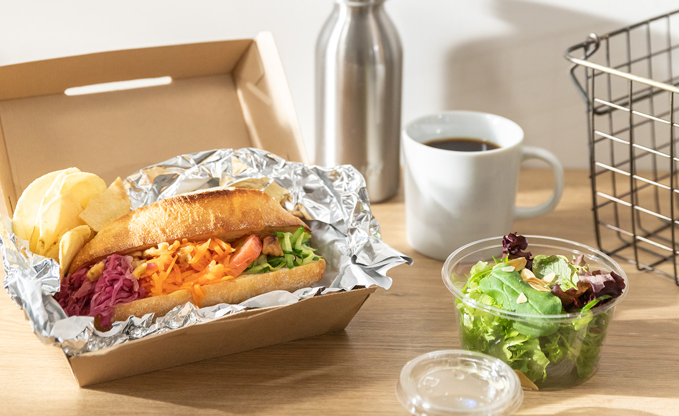 朝食は、自家製のフォカッチャサンドをお部屋へデリバリー。「朝はゆっくり自分のペースで」お過ごしいただけるよう、ボックス入りの朝食セットをお部屋前までお届けします。本を片手に、ベッドの中で、あるいはテラスでくつろぎながら、おいしい時間をお楽しみください。